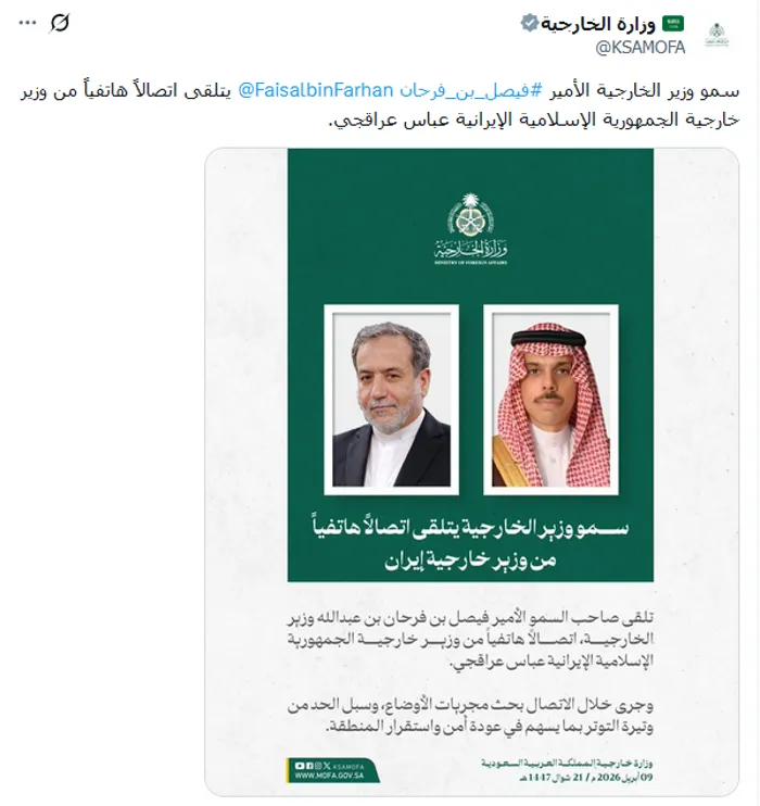 وأعلنت وزارة الخارجية الإيرانية، عبر تطبيق "تليجرام"، في ساعة مبكرة من صباح الخميس، أن وزير الخارجية الإيراني، عباس عراقجي، أجرى اتصالًا هاتفيًا بنظيره السعودي الأمير فيصل بن فرحان.