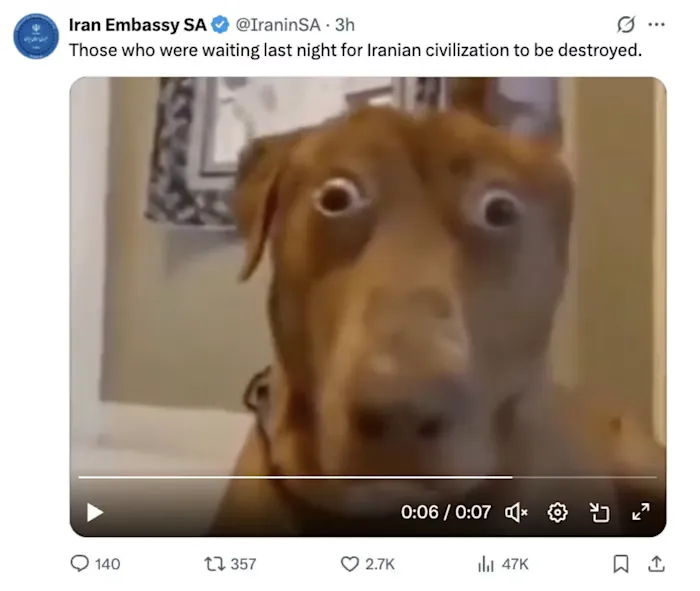 في صباح اليوم التالي لتراجع الرئيس الأمريكي دونالد ترامب عن تهديده بـ"إنهاء حضارة بأكملها" وموافقته على وقف إطلاق النار لمدة أسبوعين مع إيران، نشرت سفارة طهران في جنوب إفريقيا على موقع "إكس" مقطع فيديو ساخرًا لكلب بُنّي يحدق في الكاميرا في حيرة، وهو عنصر أساسي في "ميمات" الإنترنت (Memes) منذ فترة طويلة.