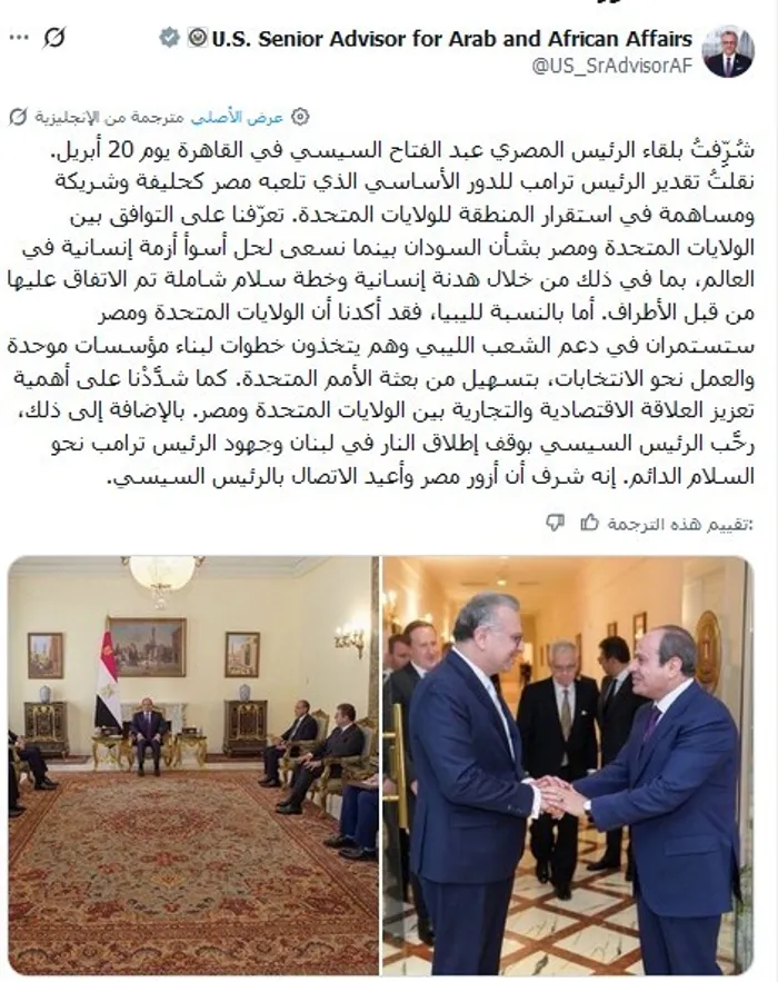 وأعرب "بولس" في أعقاب لقائه بالرئيس المصري عبدالفتاح السيسي، في القاهرة، اليوم الاثنين، عن اعتزازه بهذا اللقاء، وكتب "بولس" تدوينة على منصة "إكس"، أن الرئيس السيسي رحب باتفاق وقف إطلاق النار في لبنان، وثمّن جهود نظيره الأمريكي الرامية لتحقيق السلام الدائم بالمنطقة.