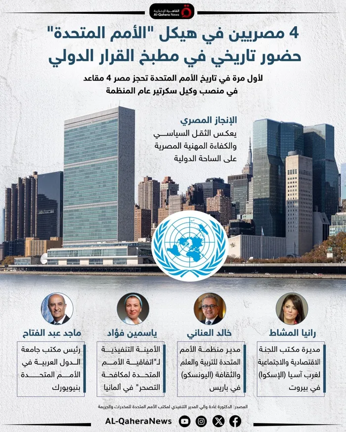 تعيش الدبلوماسية المصرية حاليًا ما يوصف بـ"عصرها الذهبي" داخل أروقة منظمة الأمم المتحدة، إذ شهدت المنظومة الدولية تعيين 4 مسؤولين مصريين في مناصب رفيعة المستوى بالتزامن، في سابقة الأولى من نوعها في تاريخ علاقة القاهرة بالمنظمة الأممية.
