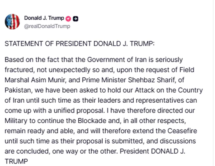 في المقابل، أعلن الرئيس الأمريكي دونالد ترامب، في منشور على منصة "تروث سوشيال" تمديد وقف إطلاق النار الموقت ضد إيران، استجابة لوساطة باكستانية رفيعة المستوى، مشروطًا بتوافق القيادة الإيرانية على مقترح موحد للمفاوضات.