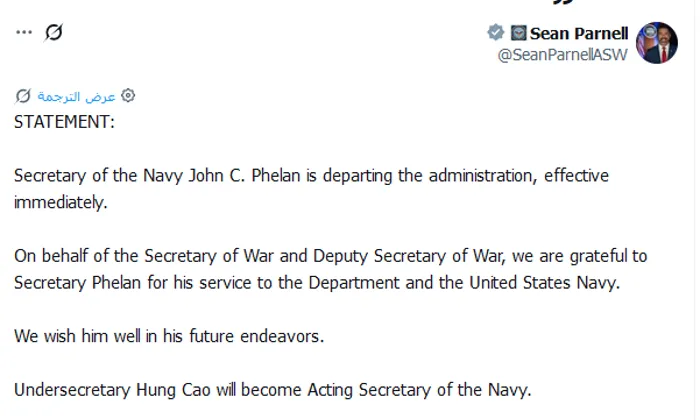 من جانبه، اكتفى المتحدث باسم البنتاجون، شون بارنيل، بمنشور عبر منصة "إكس" وجّه فيه الشكر لفيلان على خدماته، مُعلنًا تكليف وكيل الوزارة هونج كاو بالقيام بأعمال وزير البحرية بالوكالة.
