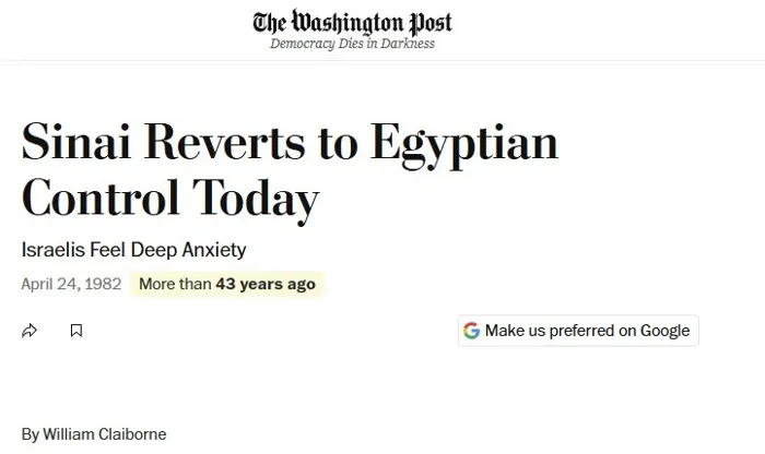 في الخامس والعشرين من أبريل 1982، رُفِع العلم المصري من جديد فوق سماء شرم الشيخ ورفح، مُعلنًا عودةً لا رجعة فيها، وفي الذكرى الرابعة والأربعين لتحرير سيناء، تعود بنا سجلات الصحافة الدولية إلى تلك اللحظة الفارقة التي رصدتها كبرى وسائل الإعلام العالمية من نيويورك إلى باريس إلى مدريد، وتركت منها شهادات حية لا تزال تحتفظ بدفء التاريخ.