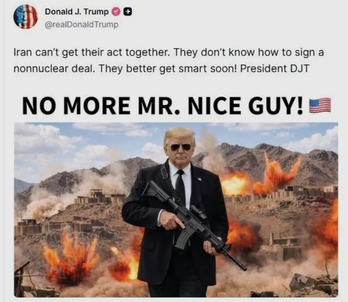 وأرفق الرئيس الأمريكي بالمنشور صورة له وهو يرتدي نظارة شمسية ويحمل مدفعًا رشاشًا، والدمار خلفه في أحد مدن إيران، وحملت الصورة عبارة "لا مزيد من الرجل اللطيف"، أو "عهد الرجل اللطيف انتهى".