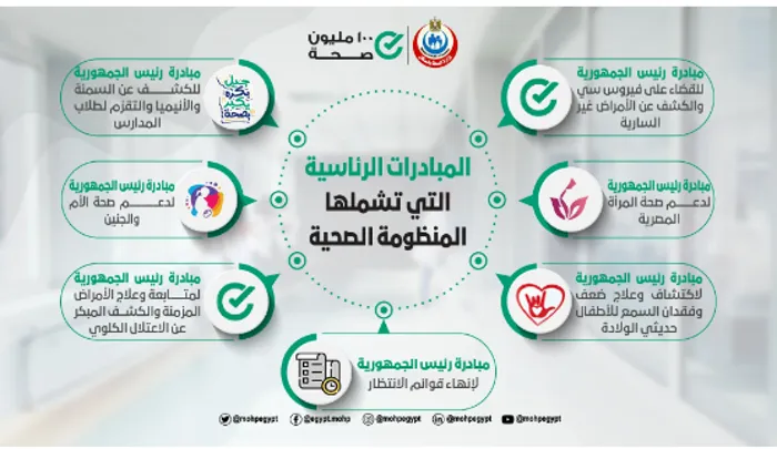 "100 مليون صحة": بعد تولي الرئيس السيسي المسؤولية أعلنت مصر حربها على فيروس"سي" بإطلاق المبادرة للكشف والعلاج مجانًا، وتمكنت من فحص 58 مليون شخص للكشف ووضعت 2.5 مليون مريض على قائمة الأدوية العلاجية، واستطاعت تحقيق هدف "إعلان مصر خالية من فيروس "سي"، بعدما كانت من الدول الأعلى عالميًا في انتشار الفيروس، واستهدفت المبادرة الكشف عن الأمراض غير السارية، كما عملت على إجراء مسح طبي لـ50 مليون مواطن، وتقديم العلاج لـ1.8 مليون مريض بالسكر و10 ملايين مرضى بالضغط.