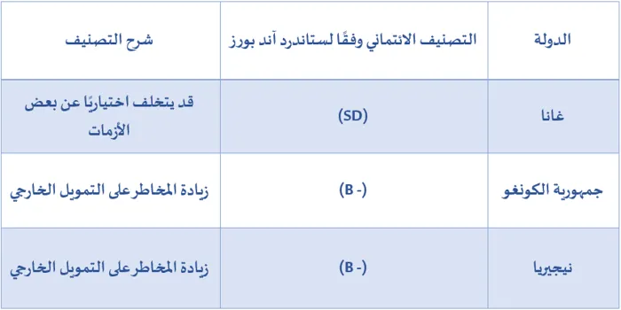 (-) انخفاض التصنيف الائتماني للدول الإفريقية: إن التصنيف الائتماني المنخفض للدول الإفريقية الذي يتم إصداره عن مؤسسات التصنيف العالمية، يتسبب في انخفاض حجم التمويلات منخفضة التكلفة من قبل مؤسسات التمويل الدولية، فوفقًا لجدول (1) الذي يُشير إلى أن التصنيف الائتماني لكل من مصر وجمهورية الكونغو ونيجيريا بلغ (B-)، بمعنى أنه يخضع لزيادة المخاطر على التمويل الخارجي، يتضح أن التصنيفات الائتمانية تسببت في رفع المؤسسات التمويلية لسعر الفائدة على إقراض هذه الدول، فقد صدر عن منظمة "الأونكتاد" أن الدول الإفريقية تدفع فوائد على القروض أكثر 8 مرات مما تدفعه الدول الأوروبية؛ بسبب التقييم غير العادل الصادر عن مؤسسات التصنيف الدولية.