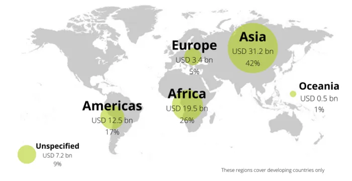 فوفقًا لشكل (3) يتضح أن تمويل المناخ في الدول الإفريقية لا يتناسب مع حجم الضرر الواقع على هذه الدول، إذ يبلغ حجم تمويله 19.5 مليار دولار في القارة الإفريقية بنسبة 26%، بينما يبلغ في آسيا 31.2 مليار دولار بنسبة 42%، وحسبما أشار الرئيس المصري عبد الفتاح السيسي، فالتعهدات التي خلُص إليها مؤتمر باريس في عام 2015 والتي قررت ضخ 100 مليار دولار سنويًا لصالح الطاقة والمناخ، لم تُحقق بعد مرور 9 سنوات على المؤتمر، على الرغم من أن الدول الكبرى هي المسؤولة عن تغيرات المناخ في العالم.