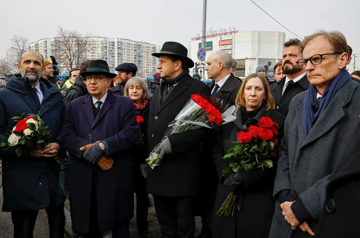 وقد وصل دبلوماسيون أجانب، بمن فيهم سفيرا فرنسا والولايات المتحدة لدى روسيا، لتقديم العزاء للعائلة، وحمل أربعة من حاملي النعش الذي يحتوي على رفات المعارض الروسي إلى الكنيسة، بينما هتف بعض أنصاره الواقفين في الخارج باسمه.