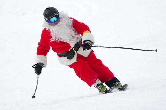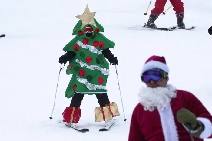 توجه عدد من عشاق شخصية سانتا كلوز أو بابا نويل إلى منحدرات تزلج لنشر بعض البهجة، أمس الأحد.