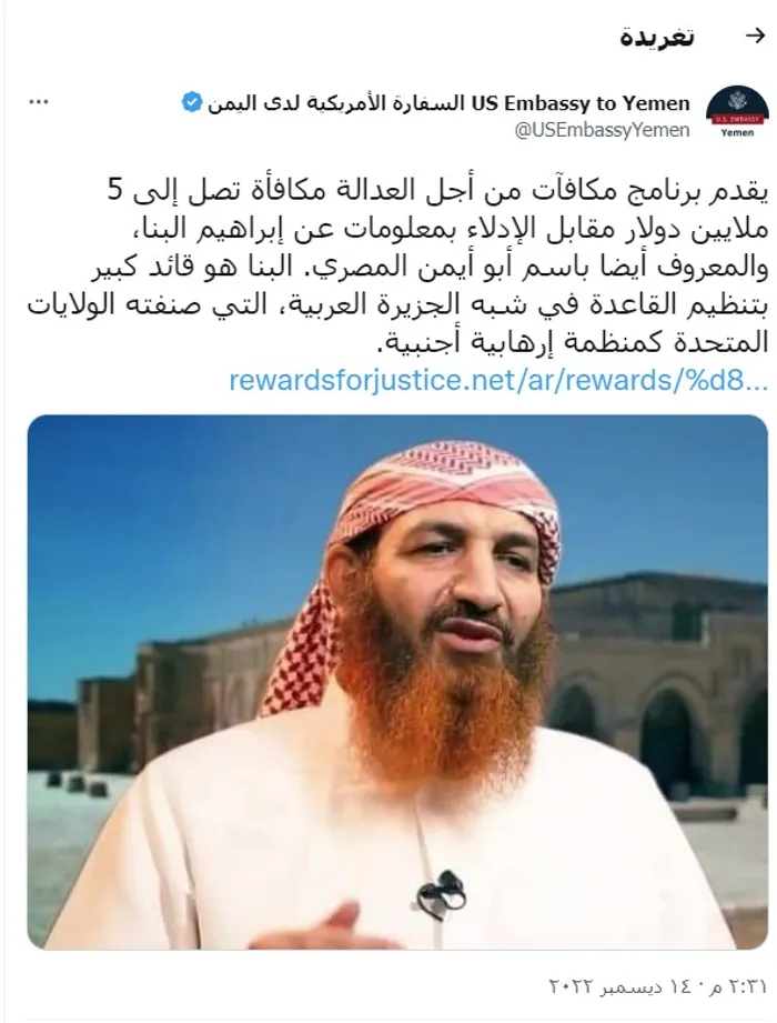 نشرت السفارة الأمريكية لدى اليمن، عبر صفحتها بموقع "تويتر"، بيانًا قالت فيه: "يقدم برنامج مكافآت من أجل العدالة، مكافأة تصل إلى 5 ملايين دولار مقابل الإدلاء بمعلومات عن إبراهيم البنا، والمعروف باسم أبو أيمن المصري.. البنا هو قائد كبير بتنظيم القاعدة في شبه الجزيرة العربية، الذي صنفته الولايات المتحدة منظمة إرهابية أجنبية".
