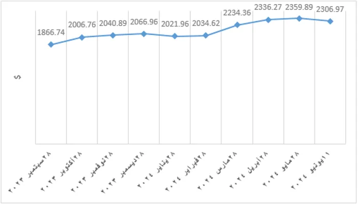 (&) ارتفاع السعر العالمي للذهب: شهد السوق العالمي للذهب ارتفاعًا كبيرًا في متوسط أسعاره خلال موجة الشراء الصينية، فكما يوضح شكل (5) ارتفع سعر أونصة الذهب من 1866.74$ في سبتمبر 2023 إلى 2359.89$ في مايو 2024، أي ارتفع سعر الذهب عالميًا بنسبة 26.42%، وهو الأمر الذي ينسبه خبراء سوق الذهب إلى المشتريات الكبيرة للصين، إذ إنها رفعت من شهية المُضاربة على الذهب كمخزن للقيمة، ويُمكن التأكد من هذا التحليل من خلال الشكل المُقابل، إذ يوضح أنه عندما توقفت الصين عن شراء الذهب في مايو 2024، انخفض سعر الأونصة عالميًا إلى 2306.97 دولار، أي انخفض سعر أونصة الذهب بنسبة 2.24%، وهو الأمر الذي يوضح التأثير الملحوظ لمُشتريات بنك الشعب الصيني من الذهب على سعره العالمي.