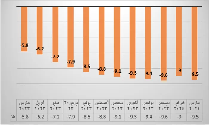 (-) ارتفاع الطلب المحلي: تذهب النظرية الاقتصادية إلى أن الطلب على منتج معين يتأثر طرديًا مع أسعار المنتجات البديلة، ويُمكن تطبيق ذلك على سوق الذهب في الصين، فعدم ثقة المُستهلكين الصينيين في الاستثمارات التقليدية مثل العقارات والأسهم، هو ما جعلهم يقبلون بشكل كبير على شراء الذهب بالجملة، إذ قاموا بشراء السبائك والمجوهرات؛ بسبب انخفاض قيمة عملة اليوان وسوق الأوراق المالية في البلاد وقيمة استثماراتهم العقارية، فكما يوضح شكل (4) انخفضت الاستثمارات العقارية في الصين بنسبة 9.5% في مارس 2024، بالمُقارنة بانخفاض قدره 9% في فبراير 2024، ويُمكن القول إنه عندما ينخفض الاستثمار العقاري، يكون الاستثمار الذي يليه هو الاستثمار في المعدن الأصفر "الذهب".