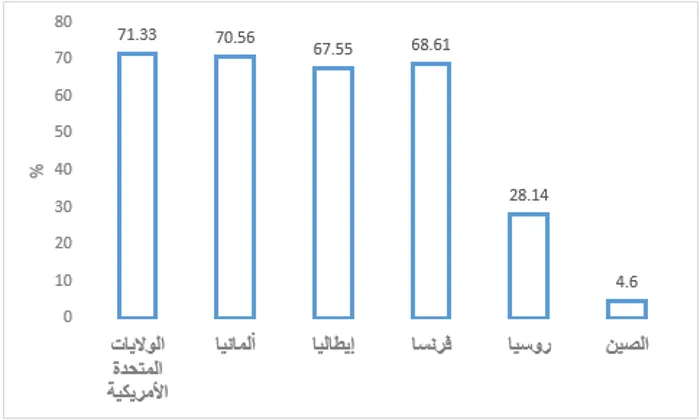 (-) انخفاض احتياطي الذهب: بمُقارنة احتياطي الصين من الذهب مع الدول المختلفة الأخرى، يتضح أنها في وضع أقل منها بكثير من حيث نسبة احتياطي الذهب من إجمالي الاحتياطي، فكما يوضح شكل (3) أن الولايات المتحدة الأمريكية تمتلك الرصيد الأكبر من احتياطي الذهب إلى إجمالي الاحتياطي الأجنبي، إذ تمتلك نحو 71.33%، وتليها ألمانيا بنسبة احتياطي ذهب 70.56%، ثم إيطاليا بنسبة 67.55%، وفرنسا بنسبة 68.61%، وروسيا الاتحادية بنسبة 28.14%، وتأتي في آخر هذه المجموعة الصين التي تمتلك 4.6% فقط احتياطي ذهب، وهو ما يدل على أن إدراك الصين لهذا الوضع جعلها تتجه إلى زيادة احتياطها من الذهب.