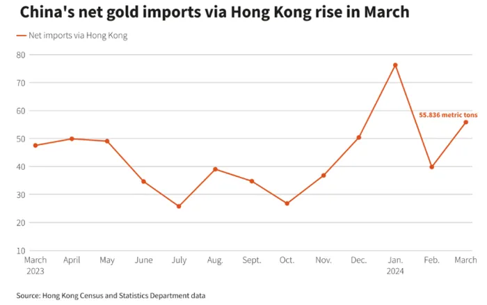 (*) ارتفاع واردات الذهب: يتضح الارتفاع الكبير في شراء الصين للذهب من ارتفاع حجم وارداتها من المعدن الأصفر، إذ كما يوضح شكل (2) أن صافي واردات الصين من الذهب عن طريق هونج كونج ارتفع إلى 55.836 طن متري في مارس 2024، وبشكل إجمالي استوردت الصين 160 طنًا من الذهب في يناير 2024 على أساس صافي، وفقًا لأحدث البيانات الصادرة عن الجمارك الصينية، وكان هذا الأمر مدفوعًا بالطلب الكبير على الذهب بالجملة داخل الصين في شهر يناير.