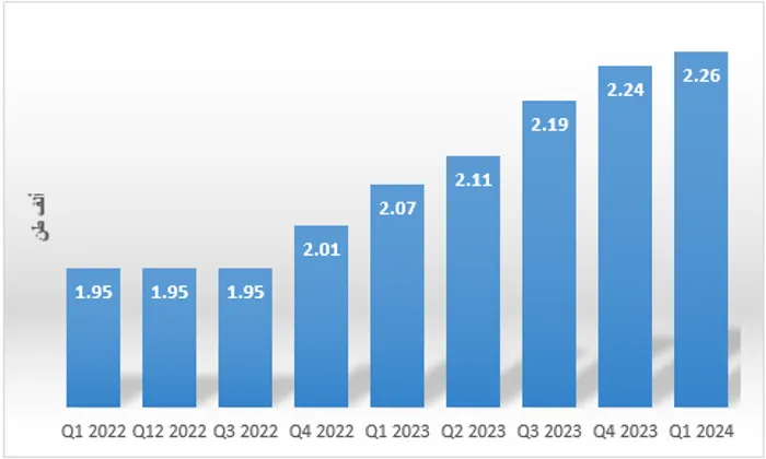 (*) ارتفاع الاحتياطي من الذهب: نتج عن سلسلة مشتريات الذهب التي نفذتها الصين، ارتفاع احتياطيها من الذهب بشكل ملحوظ خلال الربع الأول من عام 2024، إذ ارتفعت احتياطيات الصين بمقدار 5 أطنان في مارس 2024، ومن هنا أصبح الإجمالي كما يوضح شكل (1) 2.26 ألف طن، وهي زيادة ملحوظة عن السنوات السابقة، إذ بلغ حجم الاحتياطي 1.95 ألف طن في الربع الأول من عام 2022، واتخذ مسارًا تصاعديًا بعد الربع الثالث من نفس العام، حتى ارتفعت احتياطيات البلاد من الذهب بمقدار 314 طنًا منذ نوفمبر 2022، إذ بلغت نسبة المخزونات الرسمية من الذهب 44%.